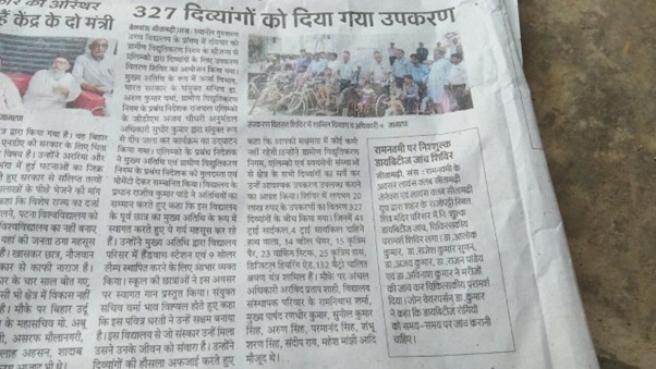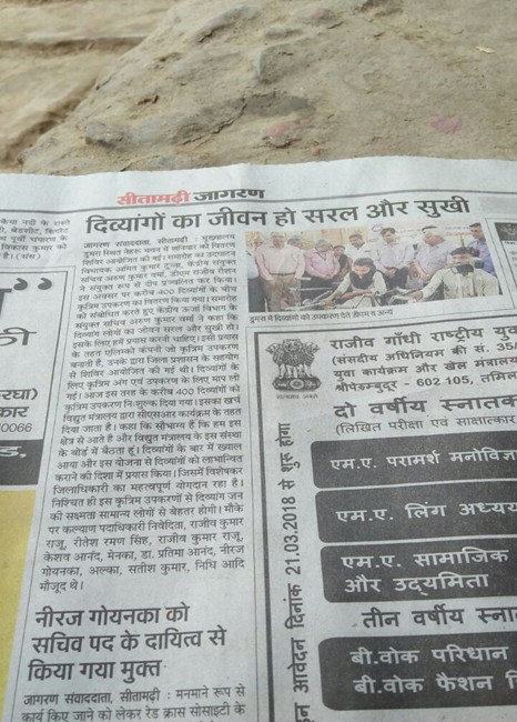 - Organising artificial limb distribution camps in association with ALIMCO.After detailed survey and consultation artificial limb distribution as well as implements/tricycles etc were made available to needing Divyangs. More than 100 people benefitted from camps organised at Belsand, Saidpur and Dumra in association with district administration.
