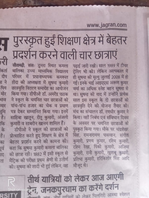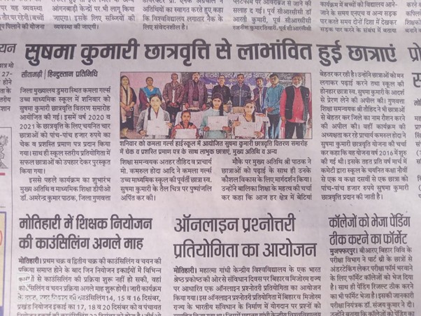 Sushma Kumari Scholarship Scheme started in Kamla Girls High School, Dumra